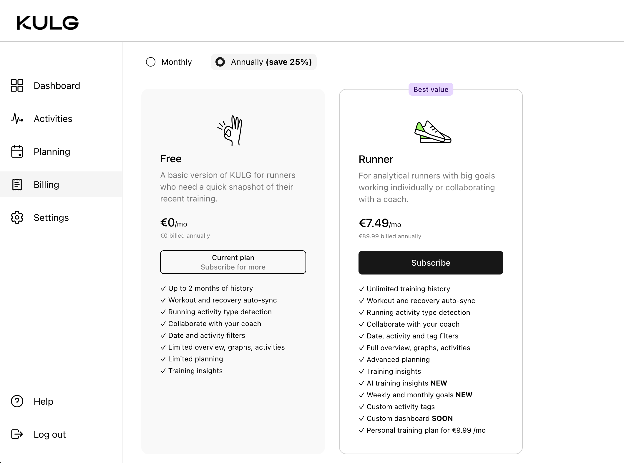 We added campaign details on the Billing page. Subscribe to the KULG Annual Runner plan before January 31 and get 40% off: €53.99 instead of €89.99.