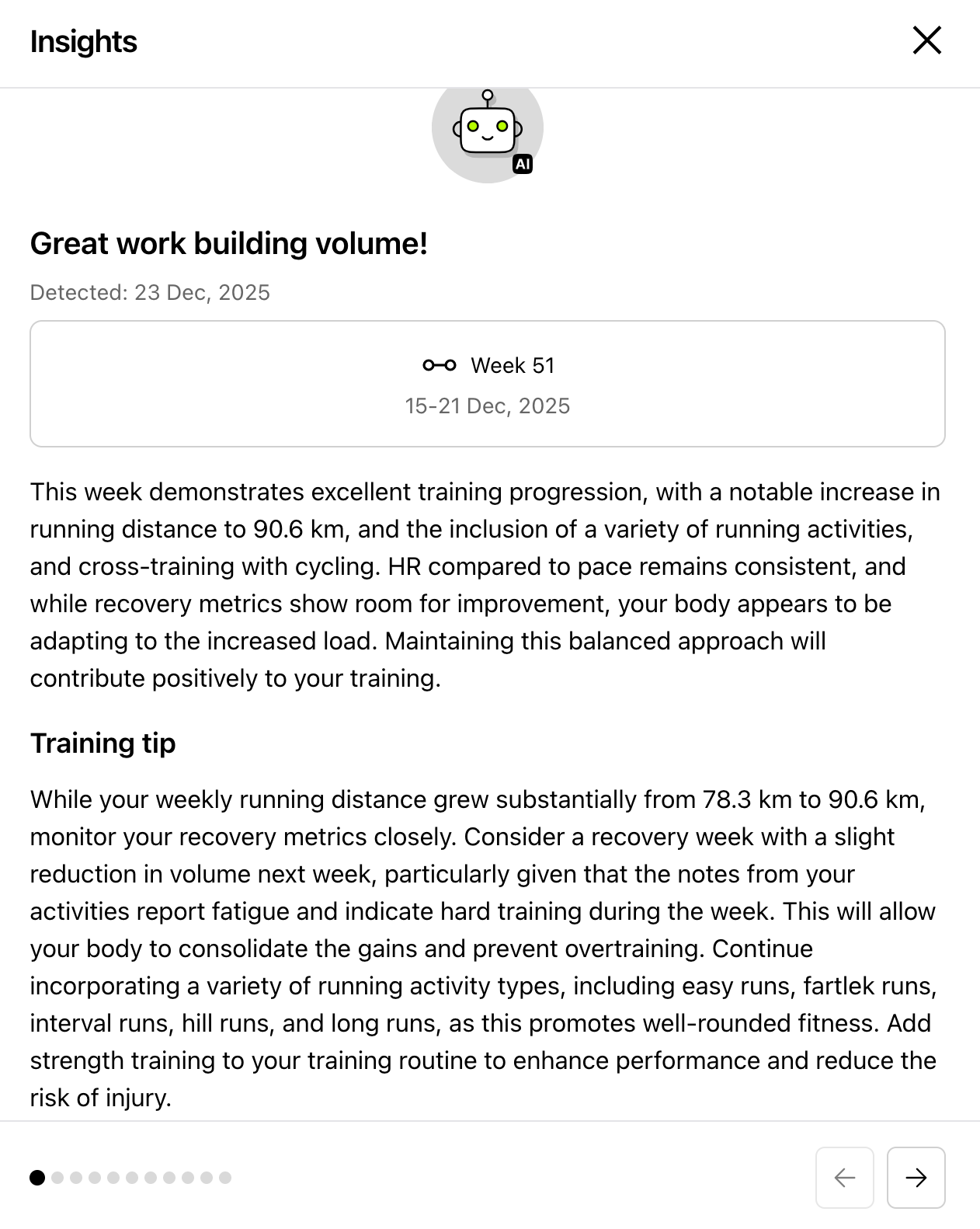 Now runners can see the most recent generated insight (including the AI insights) directly on the Overview. The latest insight remains visible until it is replaced by a new one. All inisghts are saved in the Insights’ list that you can find in the header.