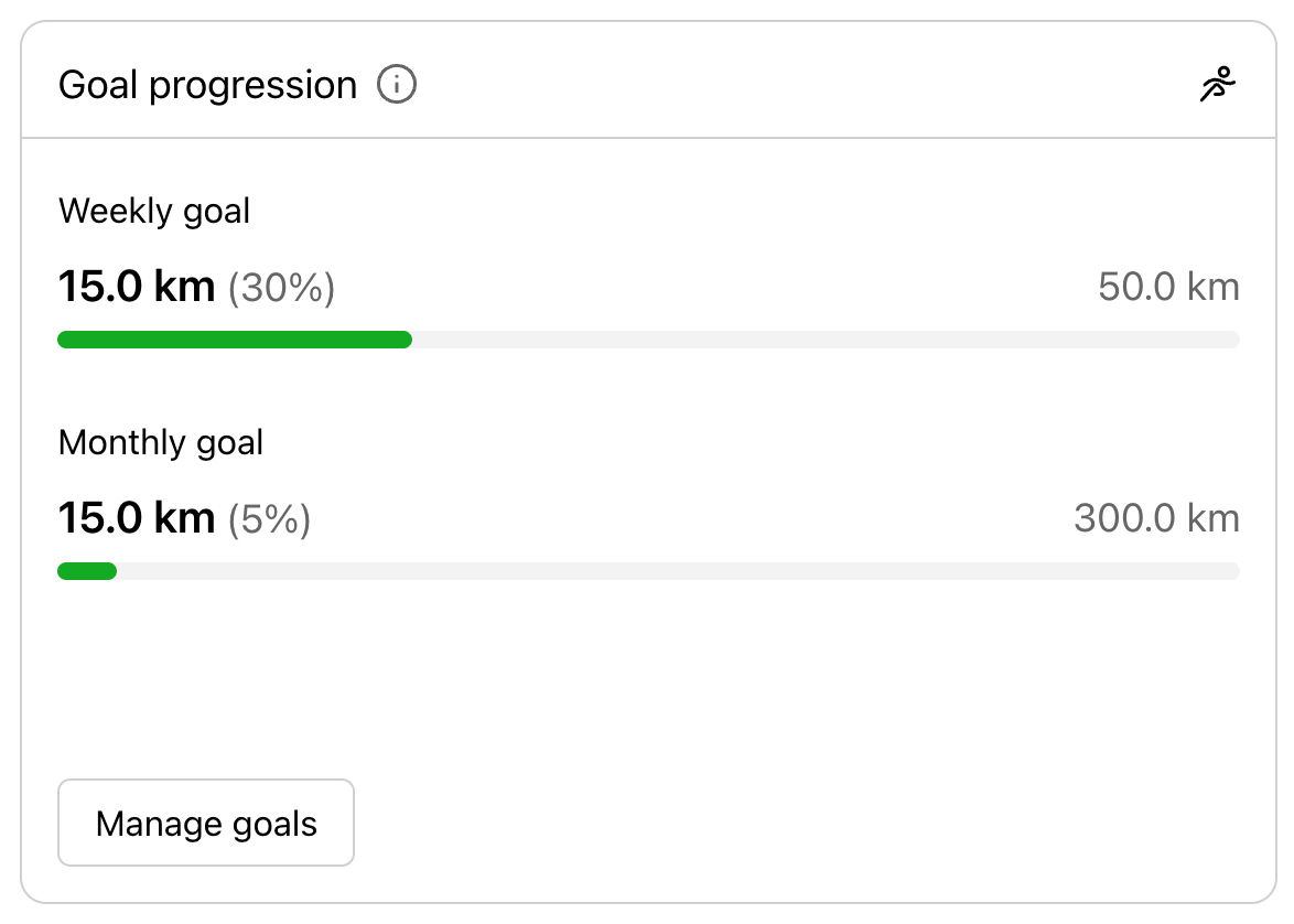 Track progress toward weekly and/ or monthly running goals and see how much you’ve already run.