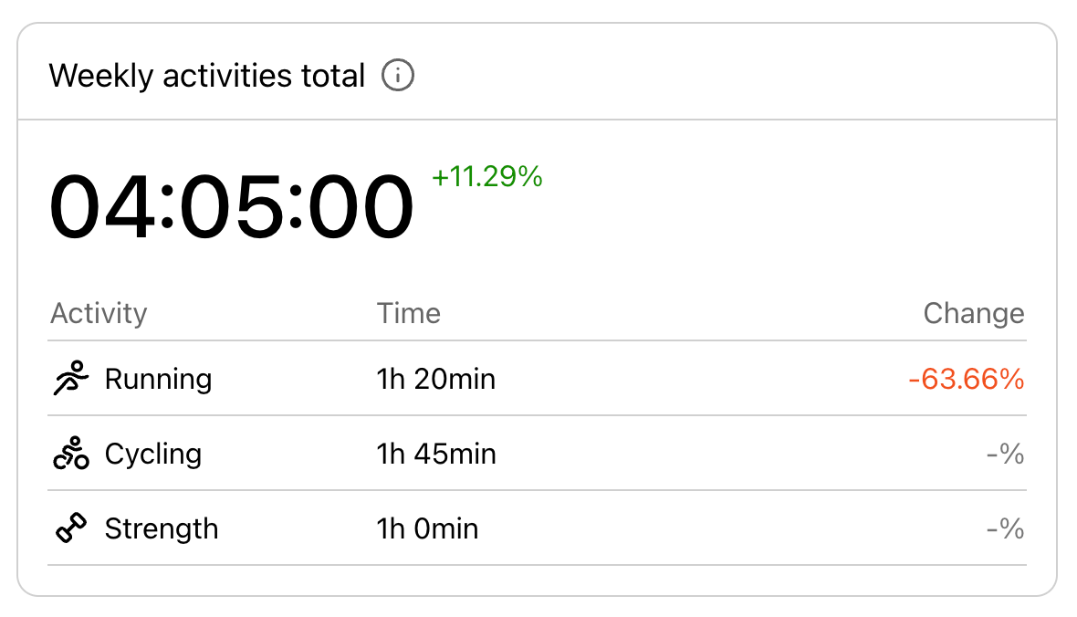 See how much time you spent on different types of training during the week (running, strength, cycling, etc.). All running activities are summarised into total running time.