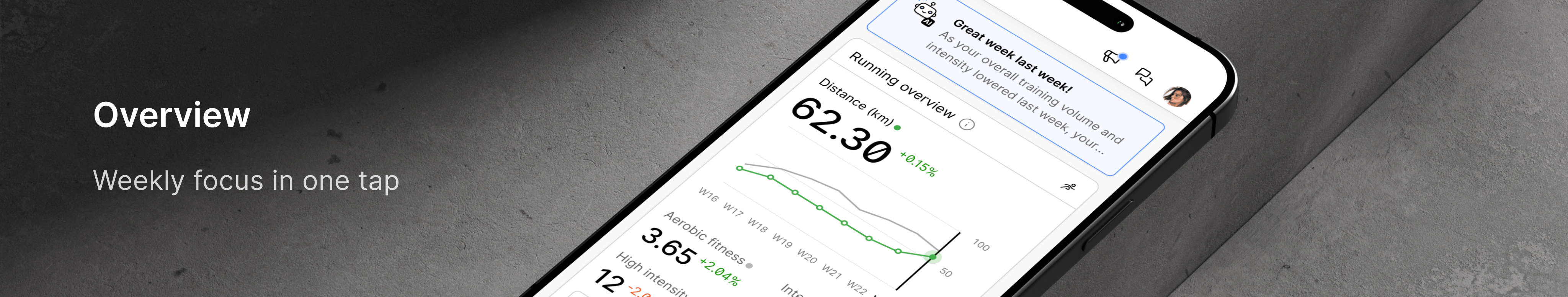 As a new development, we now also indicate the weekly change, so you can see how the key metrics have changed. The key metrics also include high intensity from your runs and it’s proportion to all runs (intensity %) and elevation gain.