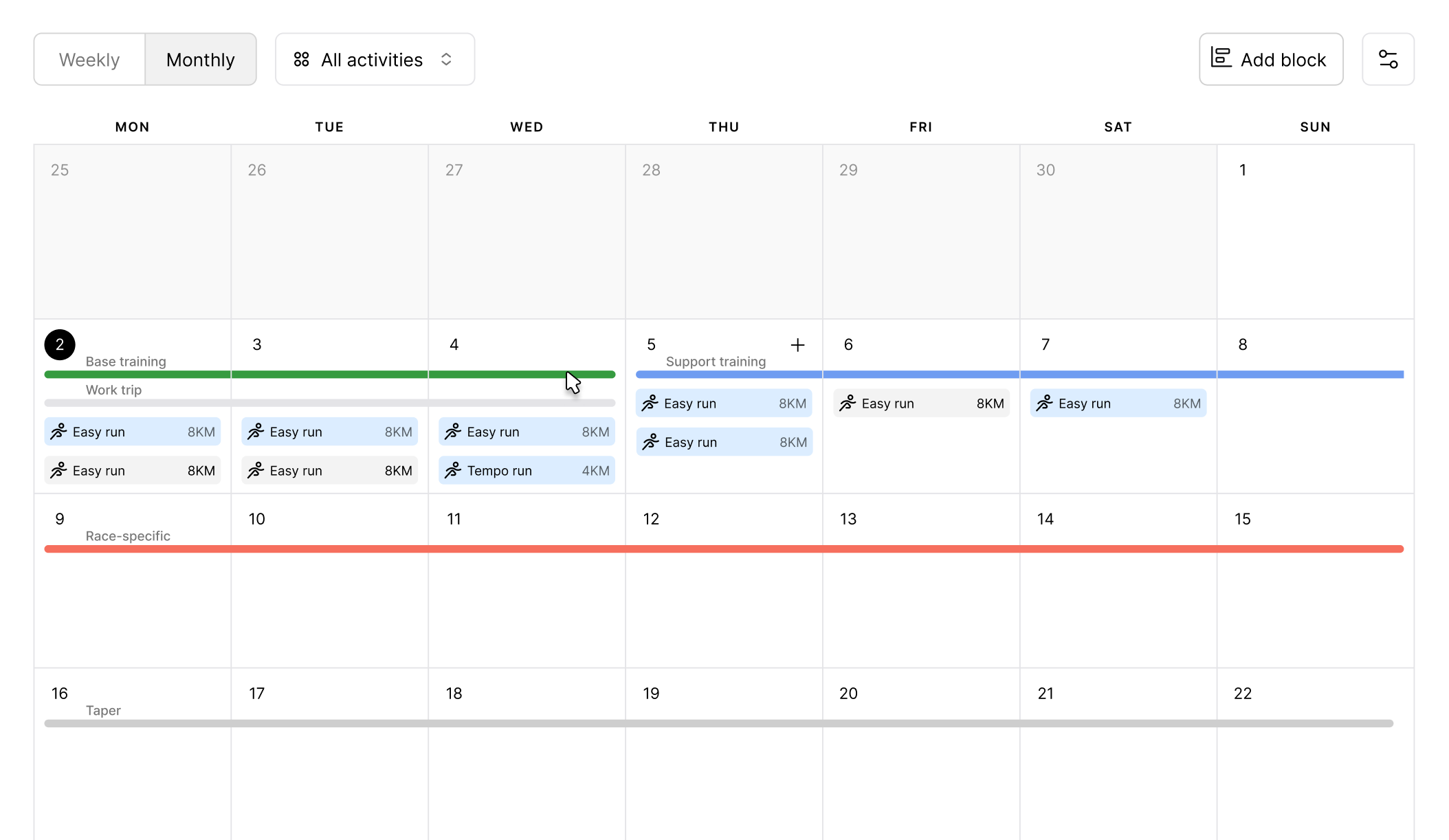 Training blocks enable to plan structured training phases over time, align athletes and coaches on long-term strategy, and provide a complete seasonal overview for athletes. Both coaches and runners with paid subscription, can now add training blocks: